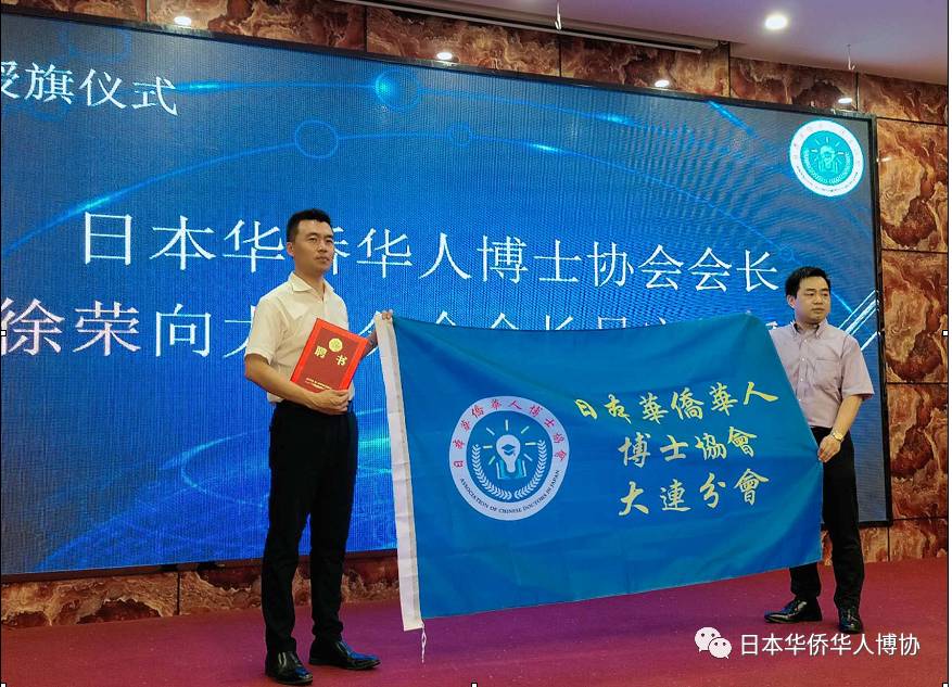 会上,徐荣会长宣布吴宏伟博士为日本华侨华人博士协会大连分会的首届会长,同时聘请林佐平教授为日本华侨华人博士协会顾问,并向二人颁发了聘书,举行了授旗仪式。