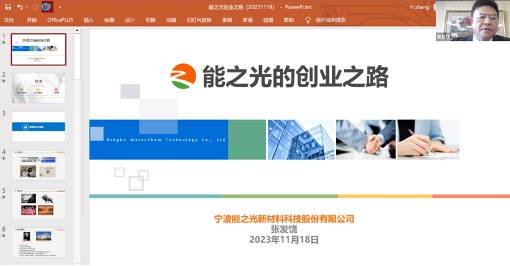 之后,宁波能之光新材料科技股份有限公司董事长张发饶博士就“能之光的创业之路”进行了精彩演讲。张发饶博士从“创业初心与选择”、“创业之路回顾”和“未来思考”三个方面对宁波能之光的发展进行了深入介绍。在演讲中,张发饶博士回顾了能之光创业之初的初心、创业地选择、以及公司在创业道路上的发展历程。他介绍了从创业的起步阶段到曲折阶段,再到稳健发展阶段的经验与总结。最后,张发饶博士对未来创业之路进行了探索,强调了研发能力的增强以及合作模式的探索。能之光的创业之路不仅是一段曲折而又成功的创业经历,更是对未来创新与发展的有益思考。张发饶博士的分享为在场的与会者提供了深刻的创业启示。