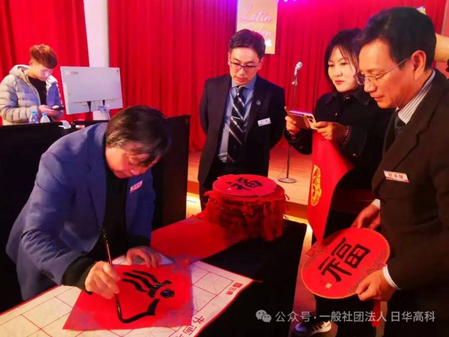 笔墨书香添雅韵。日本东京画院副院长钱根成老师现场挥毫,“务实架桥,创新贡献”遒劲作品跃然纸上,引得嘉宾驻足称赞。