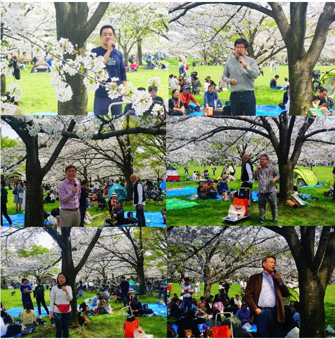 活动由来自博协事务局的李天南博士和徐婷婷主持。博协徐荣会长、科盟杨克俭会长、留日同学总会刘恩玺会长、日中科学技术文化中心贾广鑫专务理事,日中AI▪IoT产业联盟堺夏美理事,防灾环保研究会宋志毅事务局长以及燕赵会马贵臣会长(防灾环保研究会名誉会长)依次上台致辞。今年由于天气原因,赏樱活动经历了两次改期,在座的大家也因此更加珍惜这来之不易的欢聚机会。微风拂过花瓣纷飞,大家围坐在樱花树下畅谈人生,分享各自准备的零食小吃,再配上来自中国本土的红酒和啤酒,轻松而又惬意。