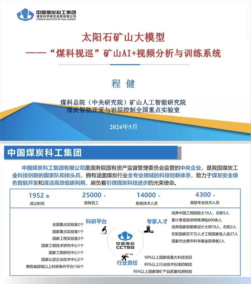 中国煤炭科工集团首席科学家程健博士,发表了题为“太阳石矿山大模型——“煤科视巡”矿山AI+视频分析与训练系统”的主题演讲。程建博士的演讲让我们深入了解了太阳石矿山大模型在煤矿“三化”转型中的重要作用。尤其在煤矿井下视频巡检技术方面的探索与实践,更是展现了人工智能技术在煤炭行业的广泛应用和深远影响。不仅让我们对煤矿视频巡检AI算法场景的精准部署有了更为清晰的认识,也为我们展示了AI模型全生命周期管理的先进理念。