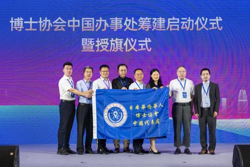 会上隆重举行博士协会中国办事处筹建启动仪式暨授旗仪式,博士协会徐荣会长为日本华侨华人博士协会中国办事处(筹)授旗。
