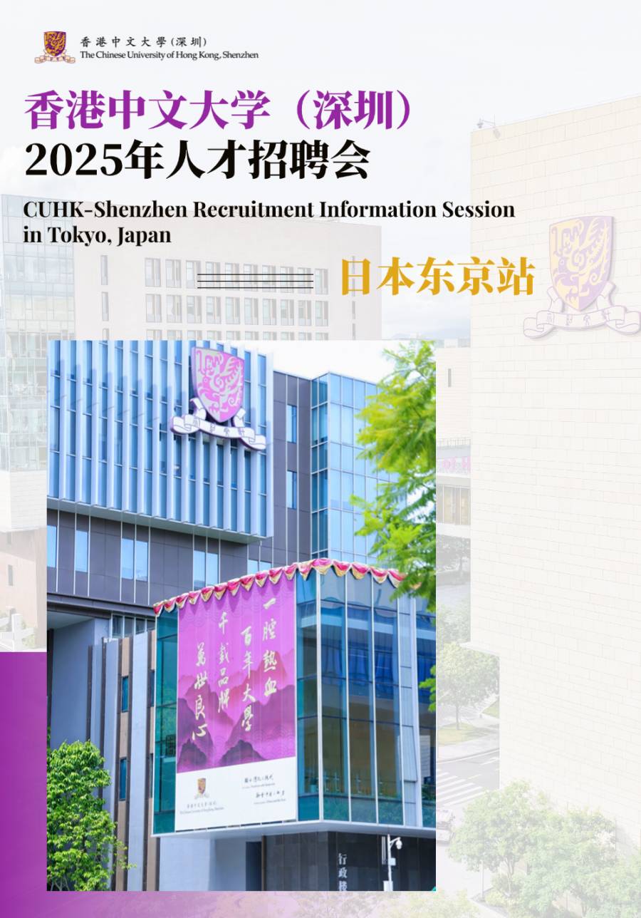 为邀请更多优秀人才加盟,加快建设世界一流研究型大学,香港中文大学(深圳)拟定于2025年10月12日晚在日本东京举行人才招聘宣讲会,主要面向教授、访问学者、研究员、博后及博士。欢迎各位有意向来我校做教职的优秀人才前来聆听交流。