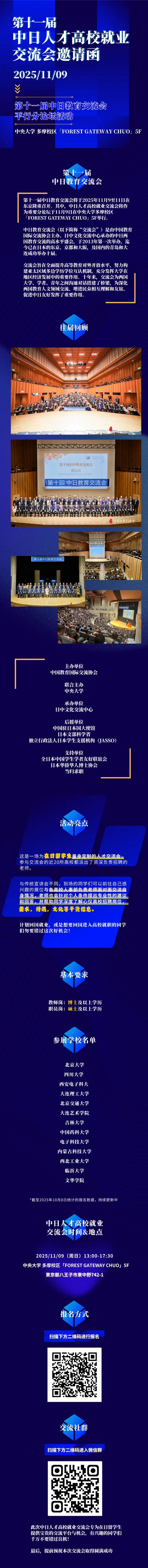 本次交流会作为第十一届中日教育交流会的重要分论坛,将于 2025年11月9日,在中央大学多摩校区隆重举行。届时,近20所中日高校的人事负责人将亲临现场,直接与你面对面交流!